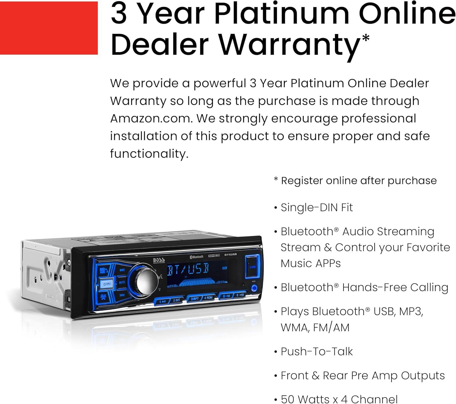 BOSS Audio Systems Provides a Powerful 3 Year Platinum Online Dealer Warranty So Long as The Purchase Is Made Through Amazon.com. We strongly encourage professional installation of this product to ensure proper and safe functionality