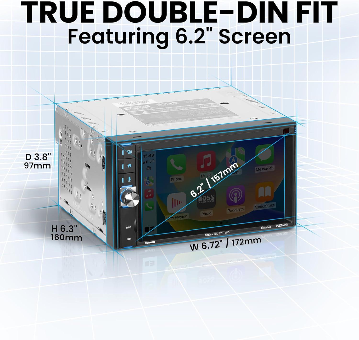 BOSS Audio Systems BCP62 Car Stereo – Apple CarPlay, Double Din, 6.2 Inch Capacitive Touchscreen, Bluetooth, No CD DVD Player, AM/FM Radio Receiver, USB