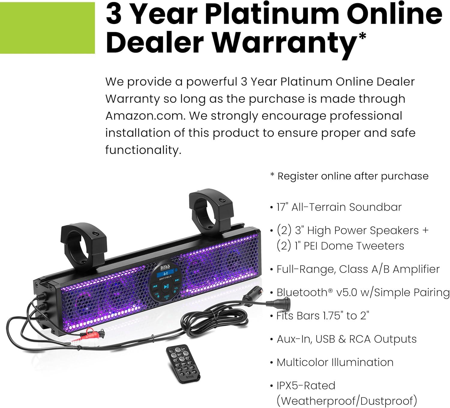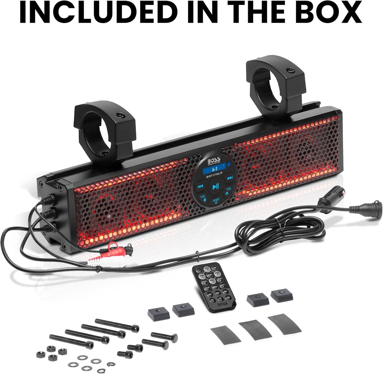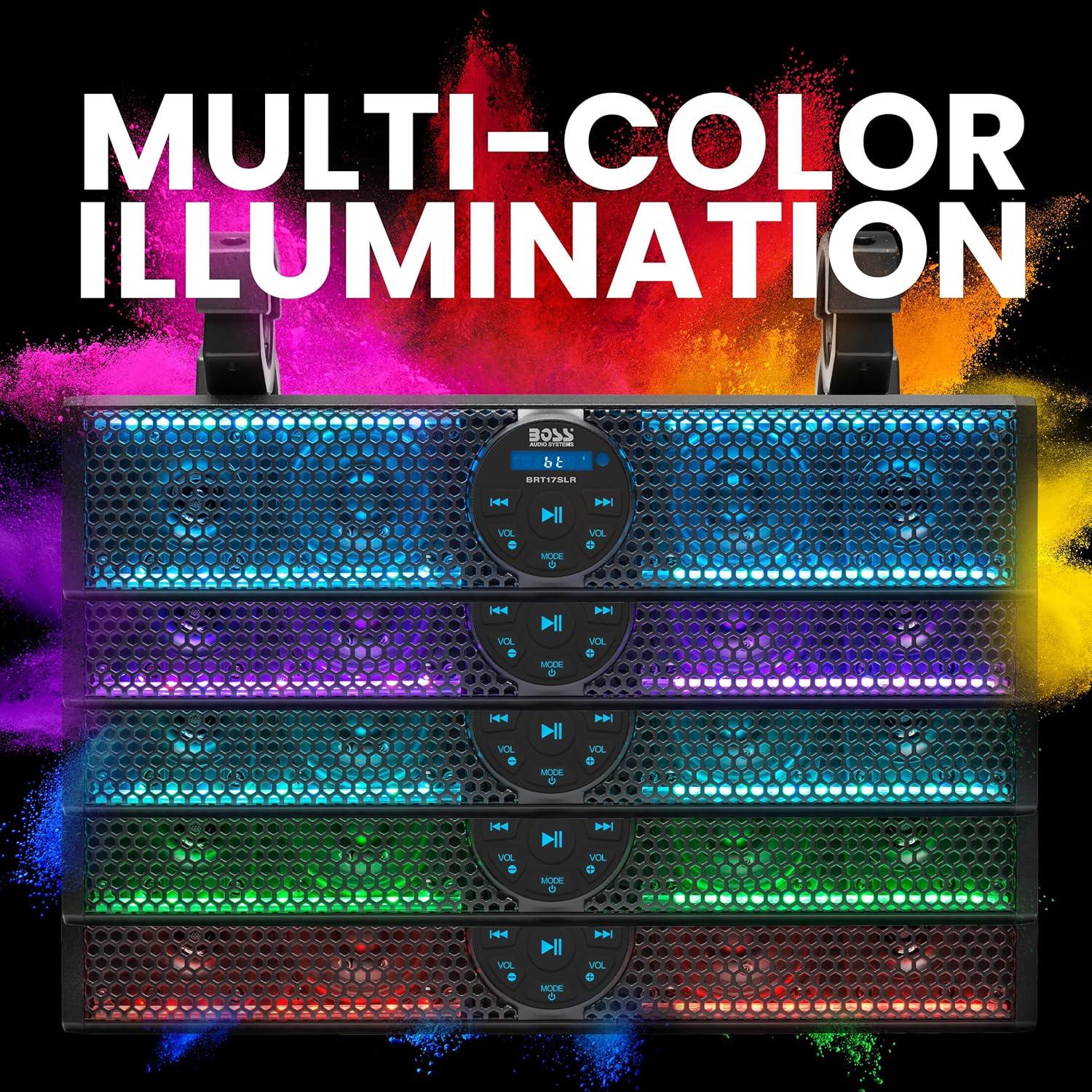 BOSS Audio Systems BRT17SLR ATV UTV Sound Bar – 17 Inches Wide, 3 inch Speakers, 1 Inch Tweeters, Full Range, IPX5 Weatherproof, Bluetooth, Built-in Amp, Multicolor Illumination, Golf Cart Compatible
