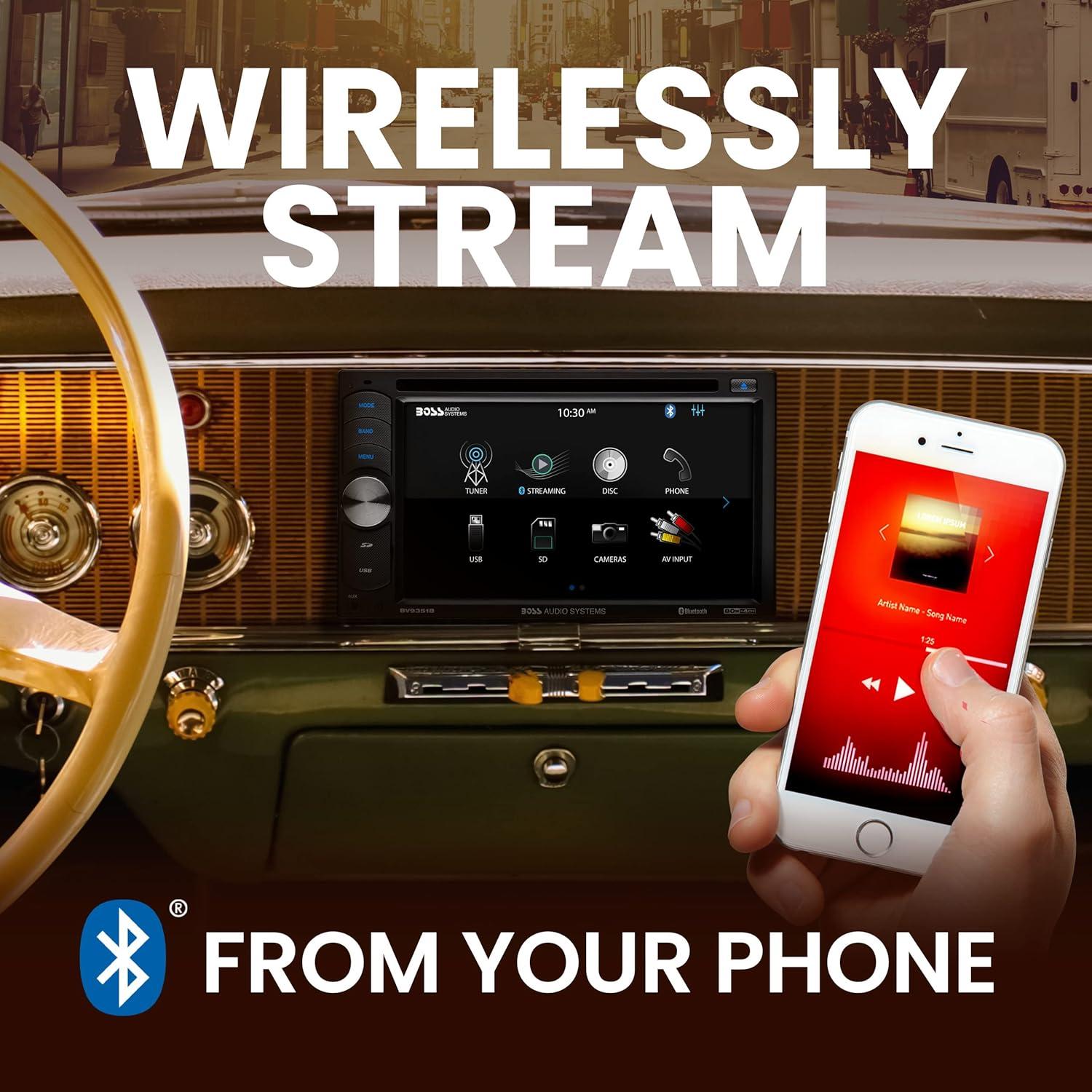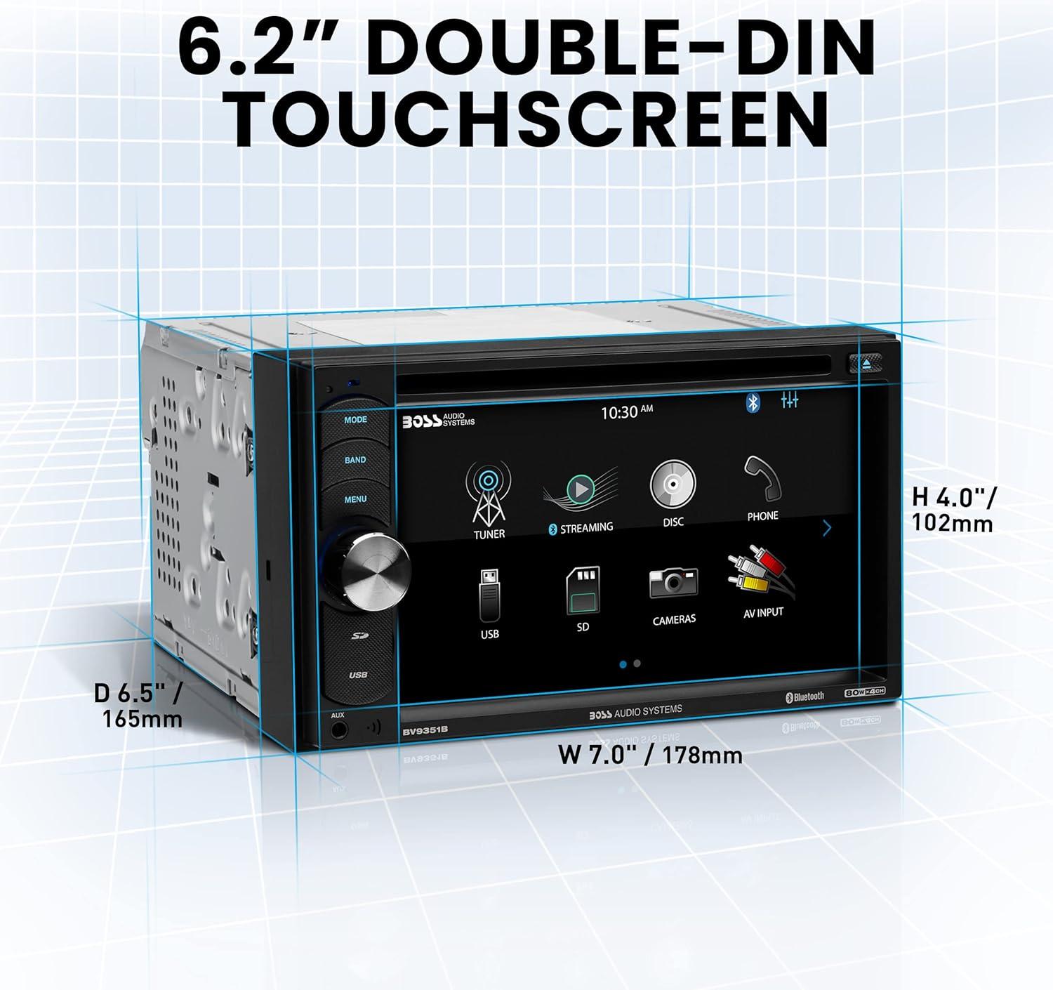 Ramp up your music choices on your next road trip with the Boss Audio BV9364B DVD Player and 6.2″ Touchscreen Monitor. Slide in a DVD or CD, plug into the SD and USB ports or hook up your smartphone to the Auxiliary input to listen to your playlists. Bluetooth technology lets you stream music apps like Pandora and Spotify and make calls hands-free. Reverse with confidence in tight spots with the included rear-view camera. Change up the sound style with the Preset EQ. Make easy adjustments with the wireless remote, existing steering wheel controls (interface required, not included) and touchscreen monitor. Put your entertainment into high gear with the BOSS Audio BV9364B. Troubleshoot-if poor sound quality or distortion is caused by speaker power rating not compatible with unit corrective action is connect proper speakers or speaker is shorted corrective action is to check speaker contrast