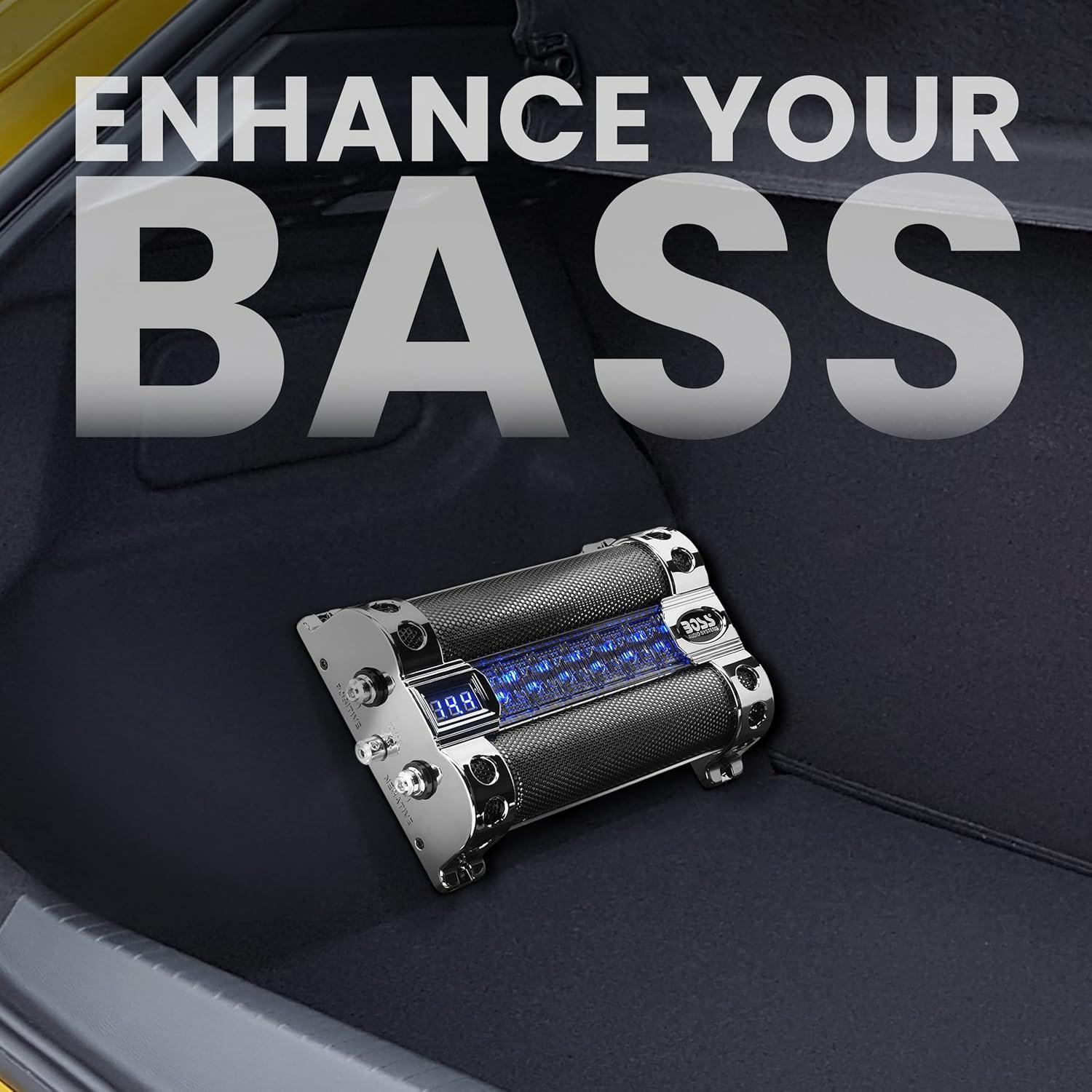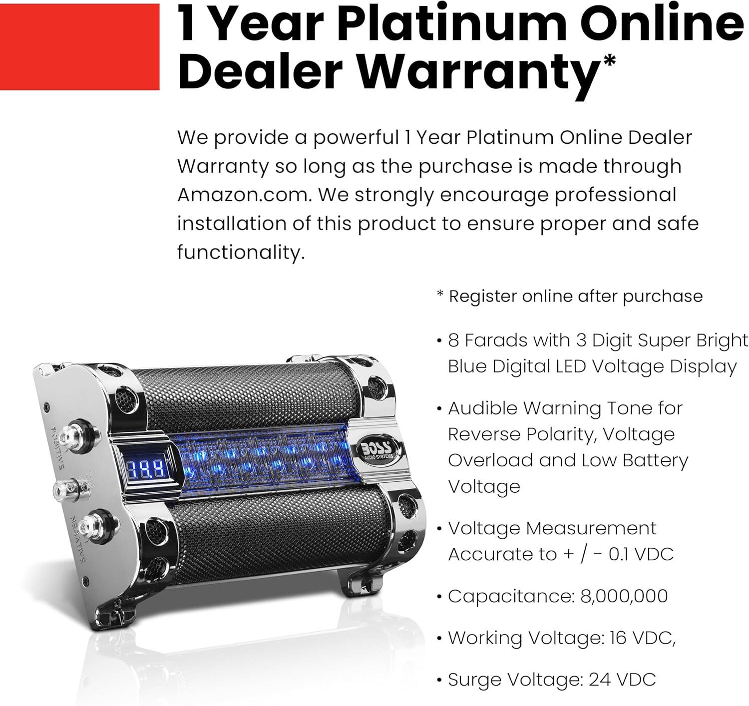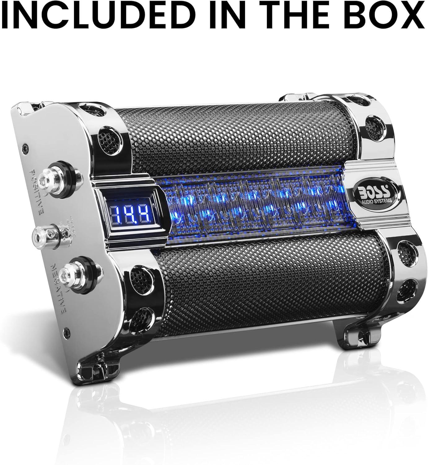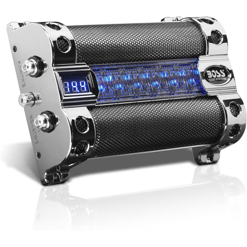 BOSS Audio Systems Cap18 - 18 Farad Car Capacitor For Energy Storage To Enhance Bass Demand From Audio System, Audible Warning Tone For Reverse Polarity, Voltage Overload Low Battery Voltage Led(8 Farad)