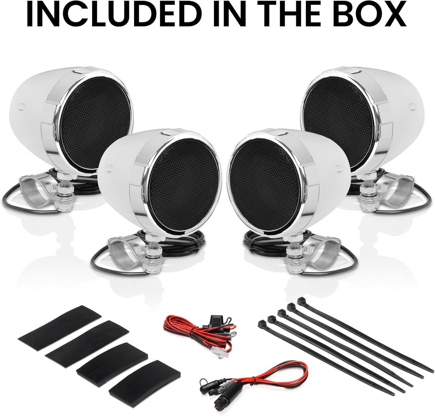 Speakers – The two 3-inch chrome full range speakers have adjustable brackets that will fit handlebars ranging from .75” to 1.5”