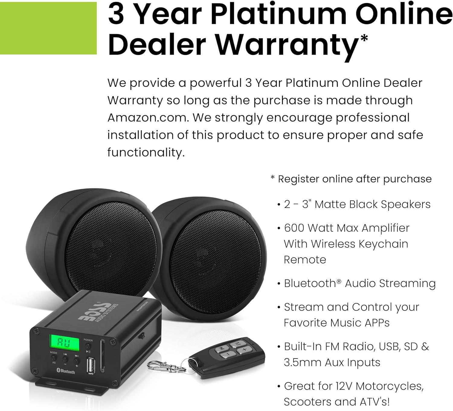 Be the first to review “BOSS Audio Systems MCBK520B Motorcycle 3 Inch Stereo Speakers and Amplifier Audio Sound System – Bluetooth 2 Channel Amplifier, Weatherproof, FM Tuner, USB, SD, Auxiliary In, ATV UTV Compatible((2) 3″ Black Speakers + Class A/B Amp)”