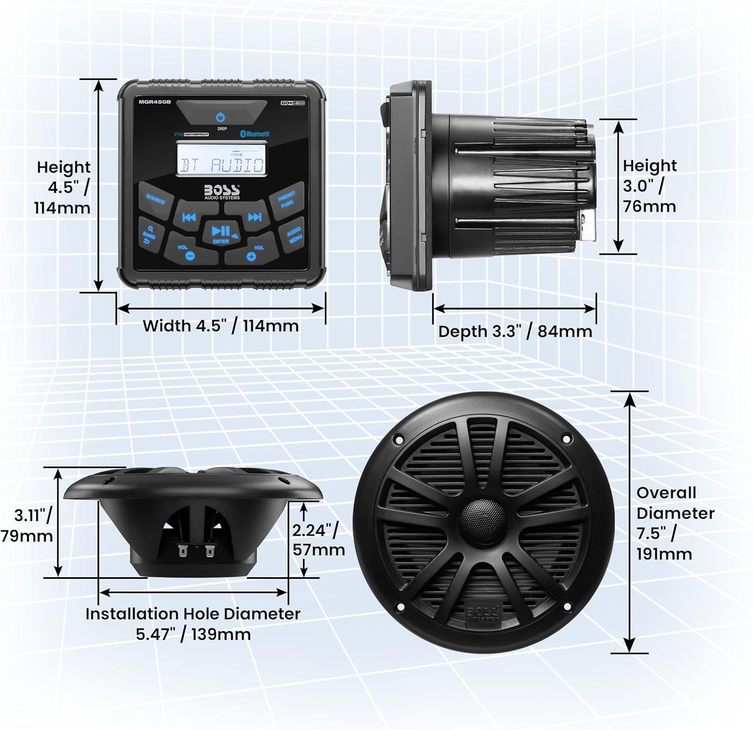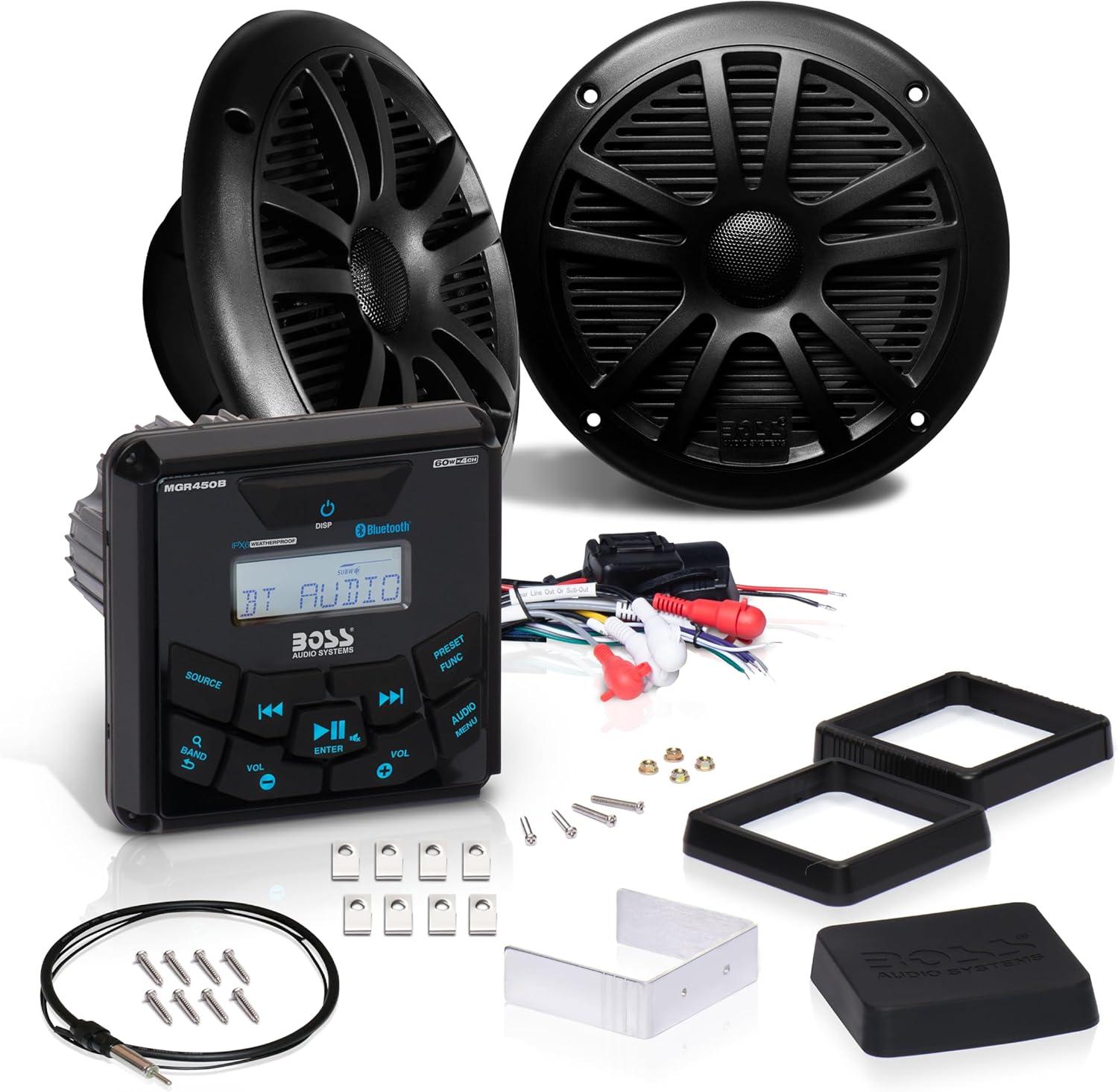 BOSS Audio Systems MGR350B Marine Boat Stereo Gauge Receiver – Bluetooth Head Unit, No CD DVD Player, Built-in 4 Channel Amplifier, Weatherproof, USB, USB Charging(MGR450B + 2 Black Speakers)