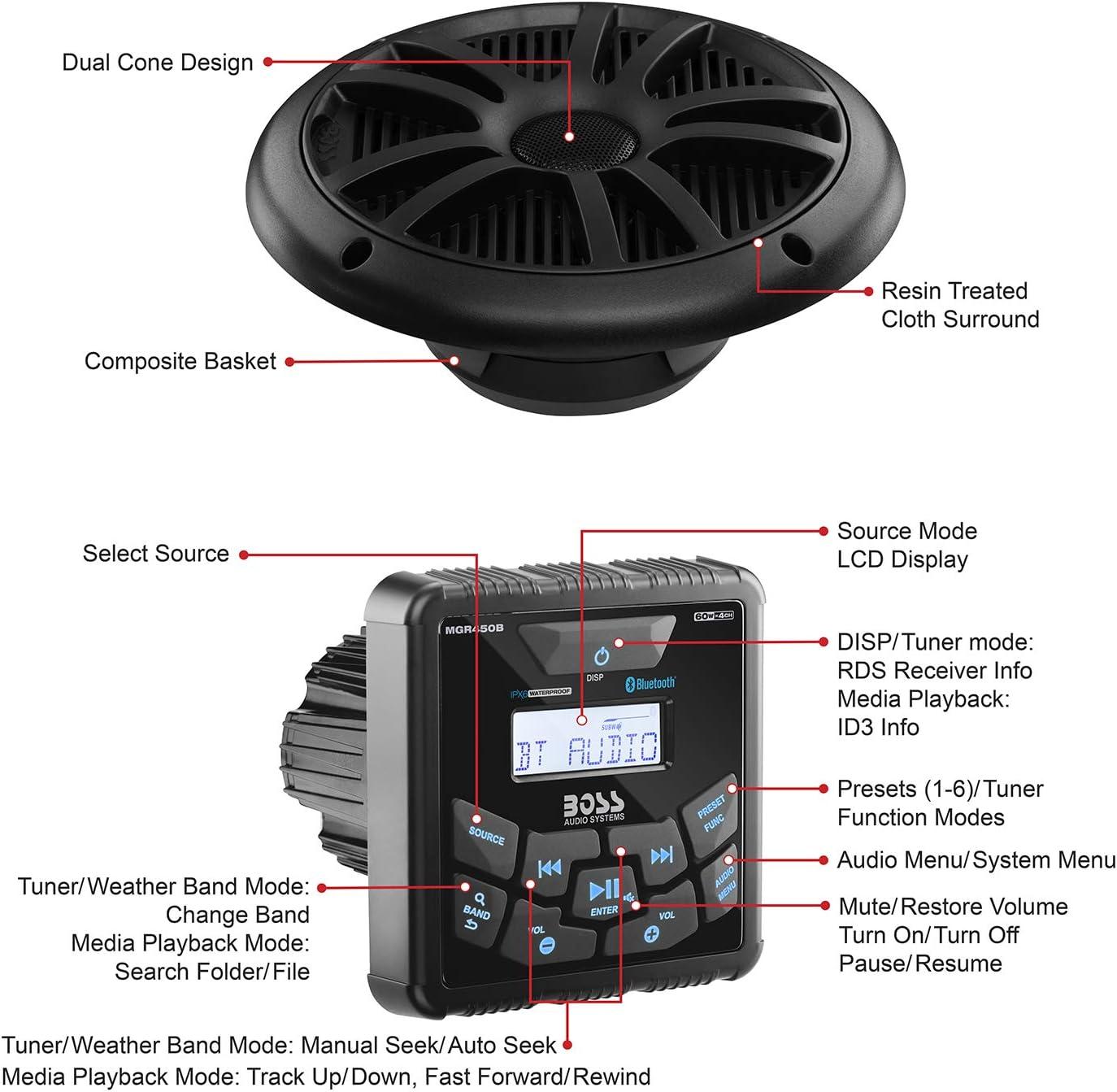 imageBOSS Audio Systems MGR350B Marine Boat Stereo Gauge Receiver  Bluetooth Head Unit No CD DVD Player Builtin 4 Channel Amplifier Weatherproof USB USB ChargingMGR450B  2 Black Speakers