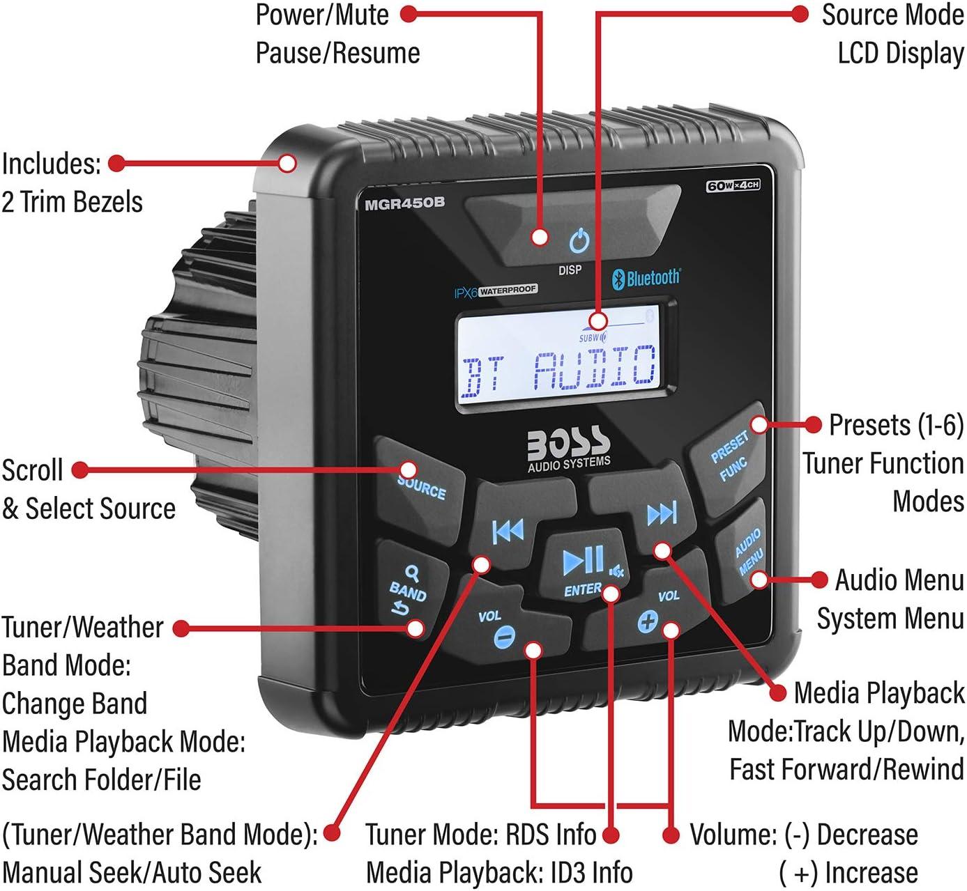imageBOSS Audio Systems MGR350B Marine Boat Stereo Gauge Receiver  Bluetooth Head Unit No CD DVD Player Builtin 4 Channel Amplifier Weatherproof USB USB ChargingMGR450B Receiver