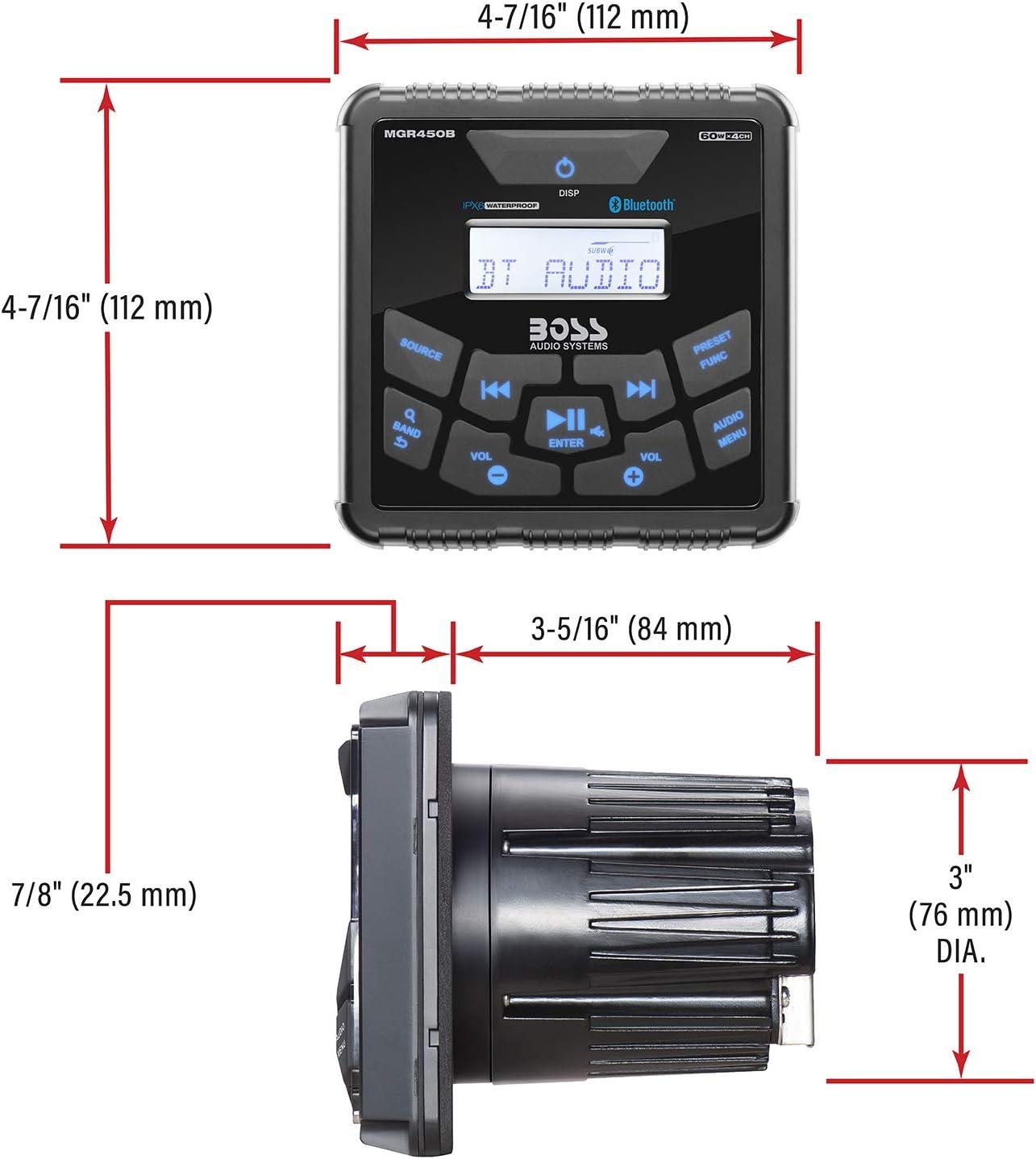 BOSS Audio Systems MGR350B Marine Boat Stereo Gauge Receiver – Bluetooth Head Unit, No CD DVD Player, Built-in 4 Channel Amplifier, Weatherproof, USB, USB Charging(MGR450B + 2 Black Speakers)