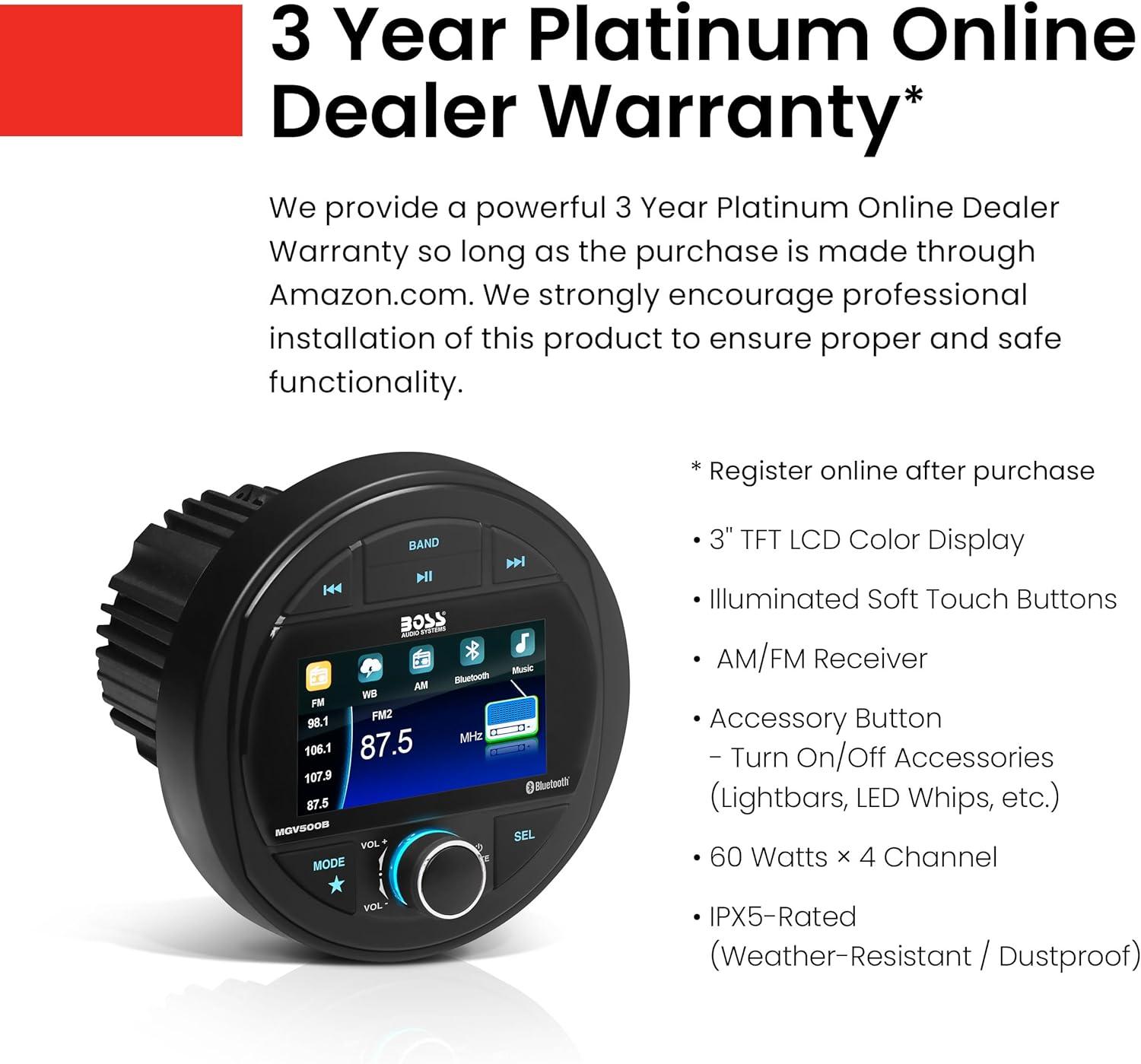Warranty – BOSS Audio Systems provides a powerful 3-year platinum online dealer warranty so long as the purchase is made through Amazon.com. We strongly encourage professional installation of this product to ensure proper and safe functionality
