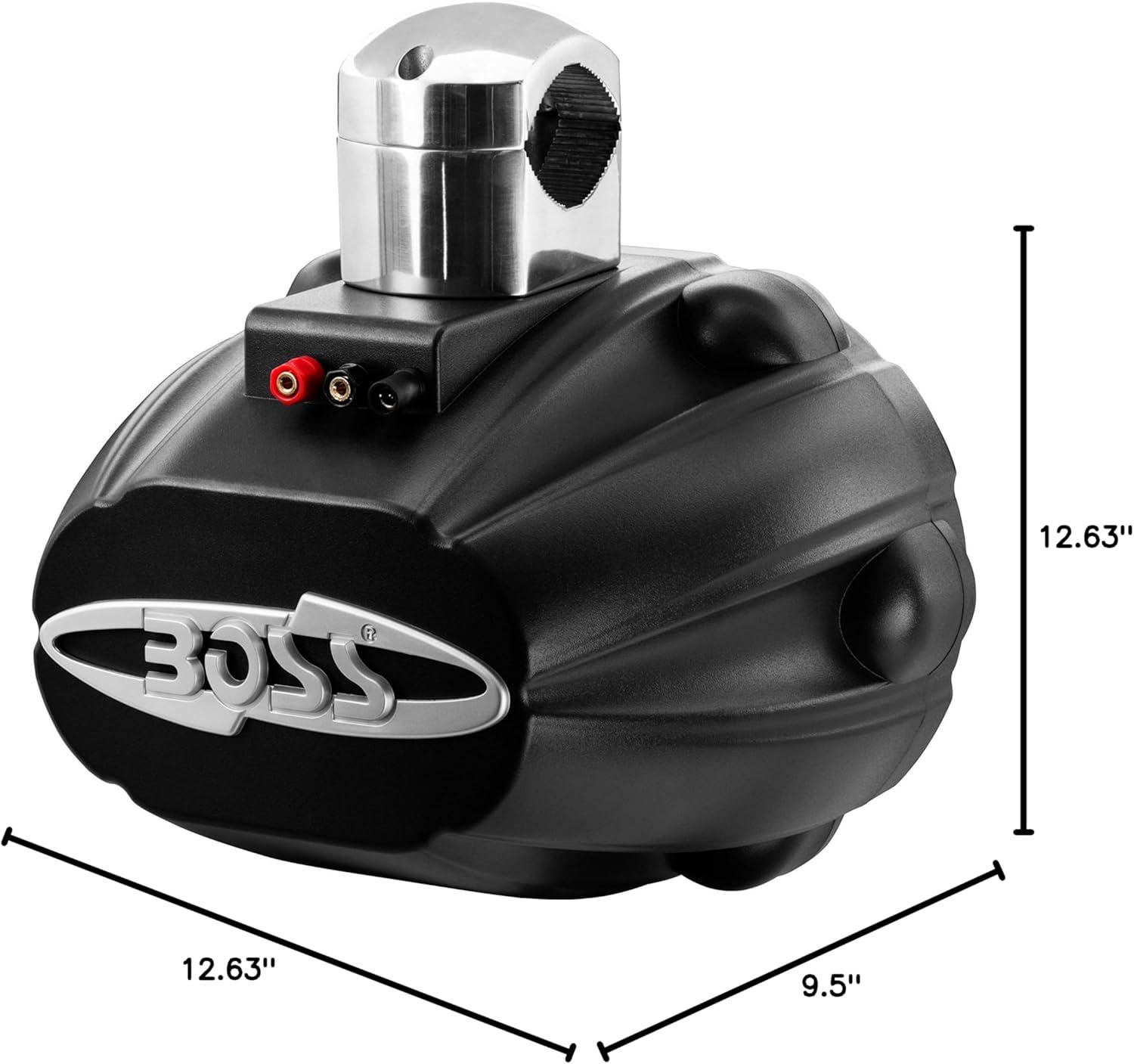 Specs – Impedance: 4 Ohms, Frequency: 65 Hz to 20 kHz, Dimensions: 9.5” x 12.63” x 12.63”, Weight: 10.10 lbs. Adjustable cast aluminum swivel clamps fits bars from 2” to 3”. Great for ATV’s, UTV cages and boats