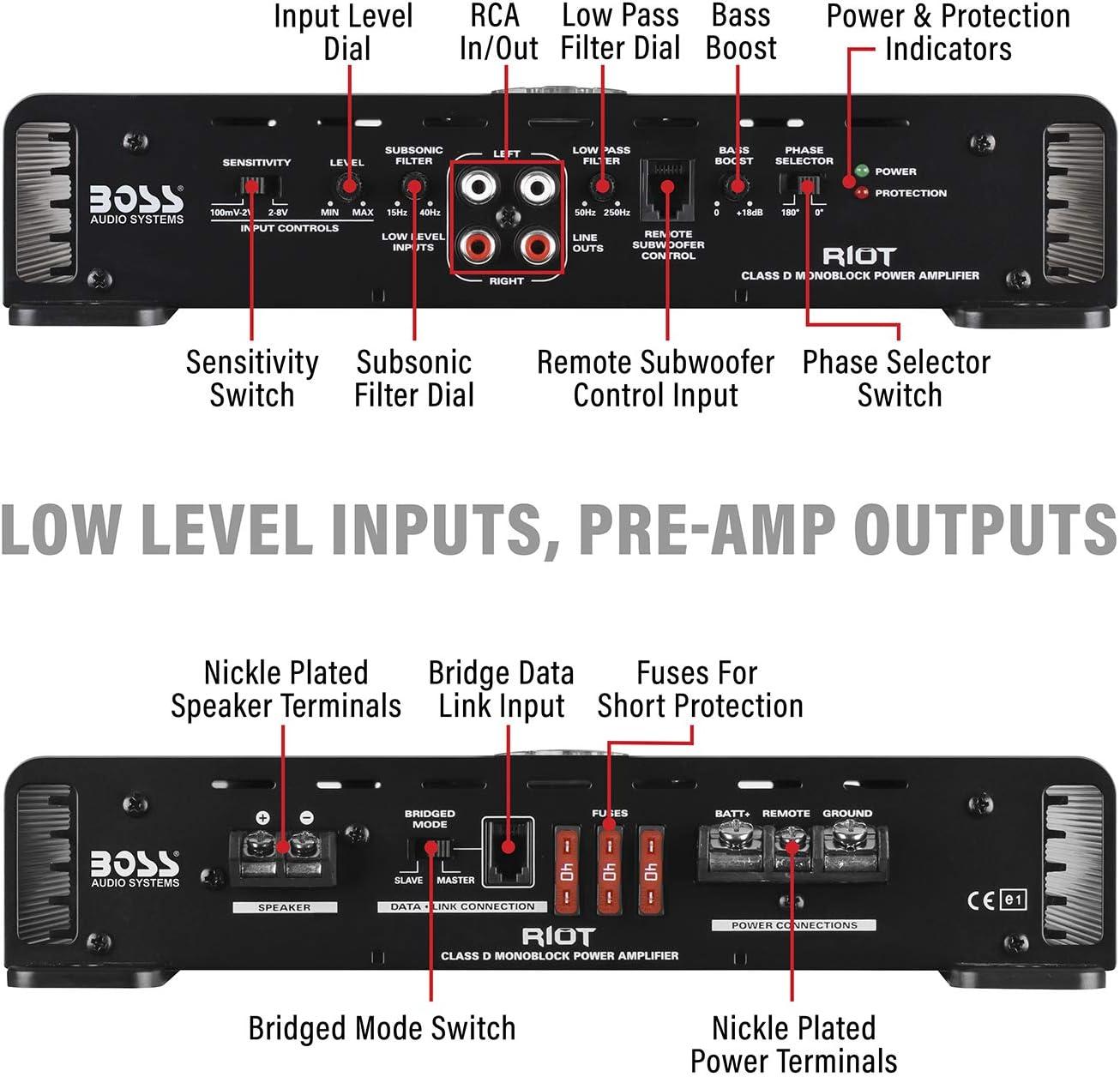 Shift your audio experience up a gear with the Boss Audio Riot R1600M Class A/B Monoblock Amplifier. This powerful 2-Ohm stable amplifier features 1600 Watts Max Power with a MOSFET power supply to rock your tunes. Customize the sound with Variable Low Pass Crossover and Bass Boost. Tweak the Bass and feel the vibes with the Remote Subwoofer Control. Amplifiers in the Riot Series are perfect for first time car audio buyers looking to add Bass, enhanced sound and performance to their system at an affordable price. Drive up the beat with the Boss Audio R1600M.