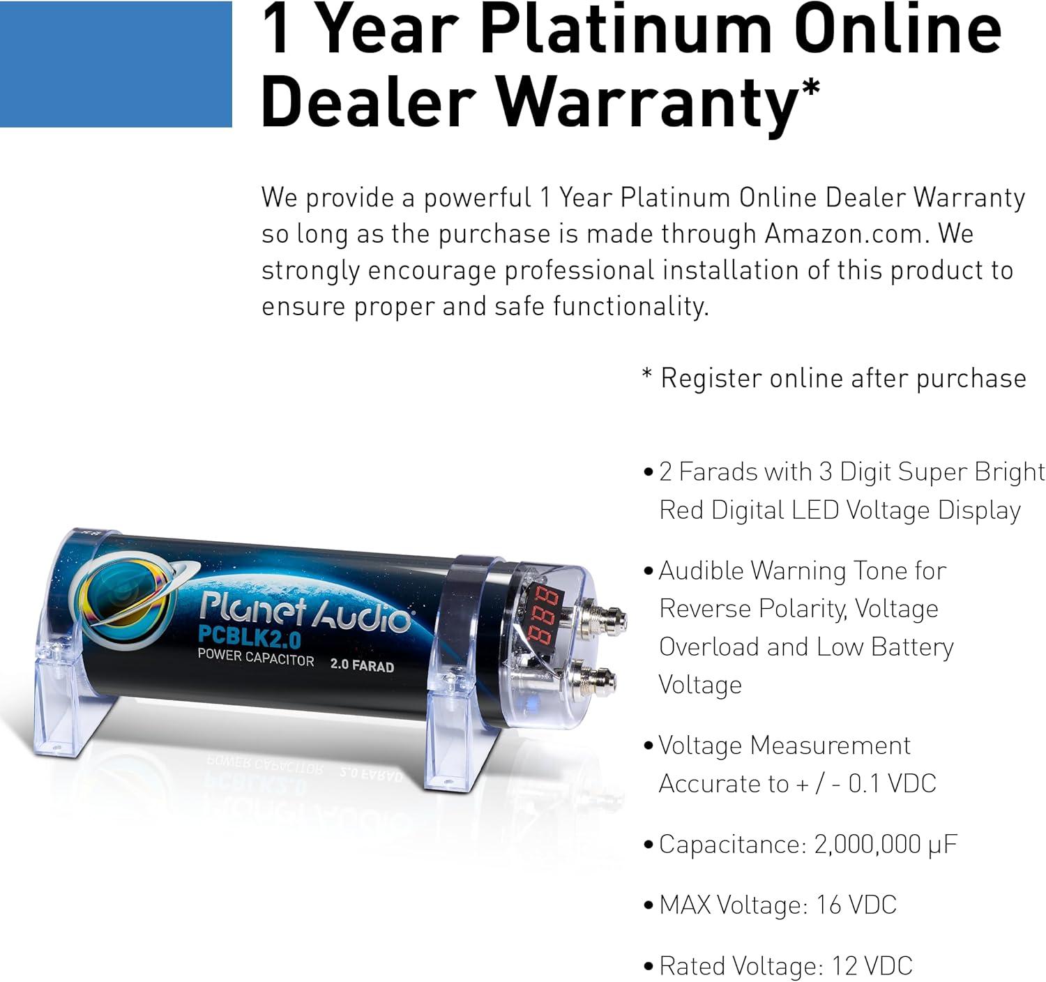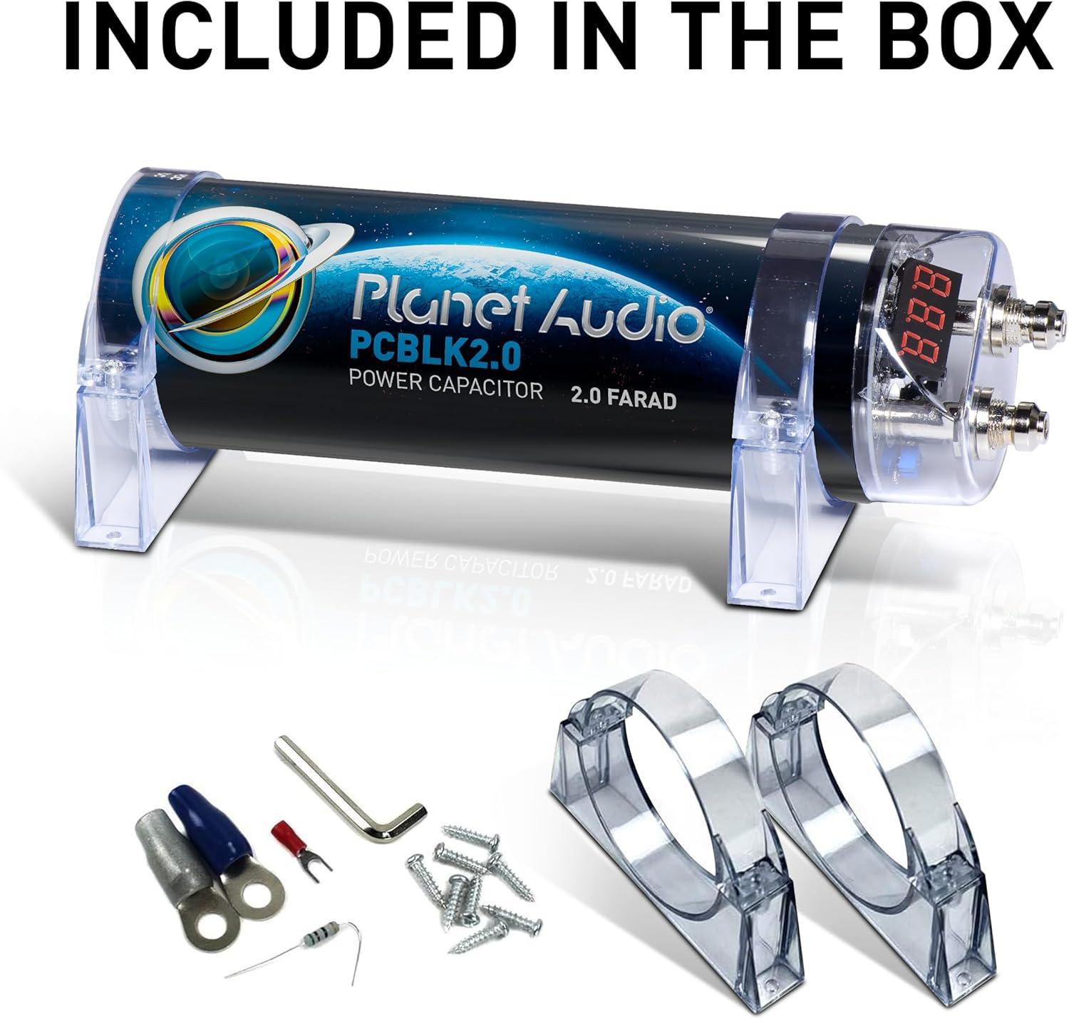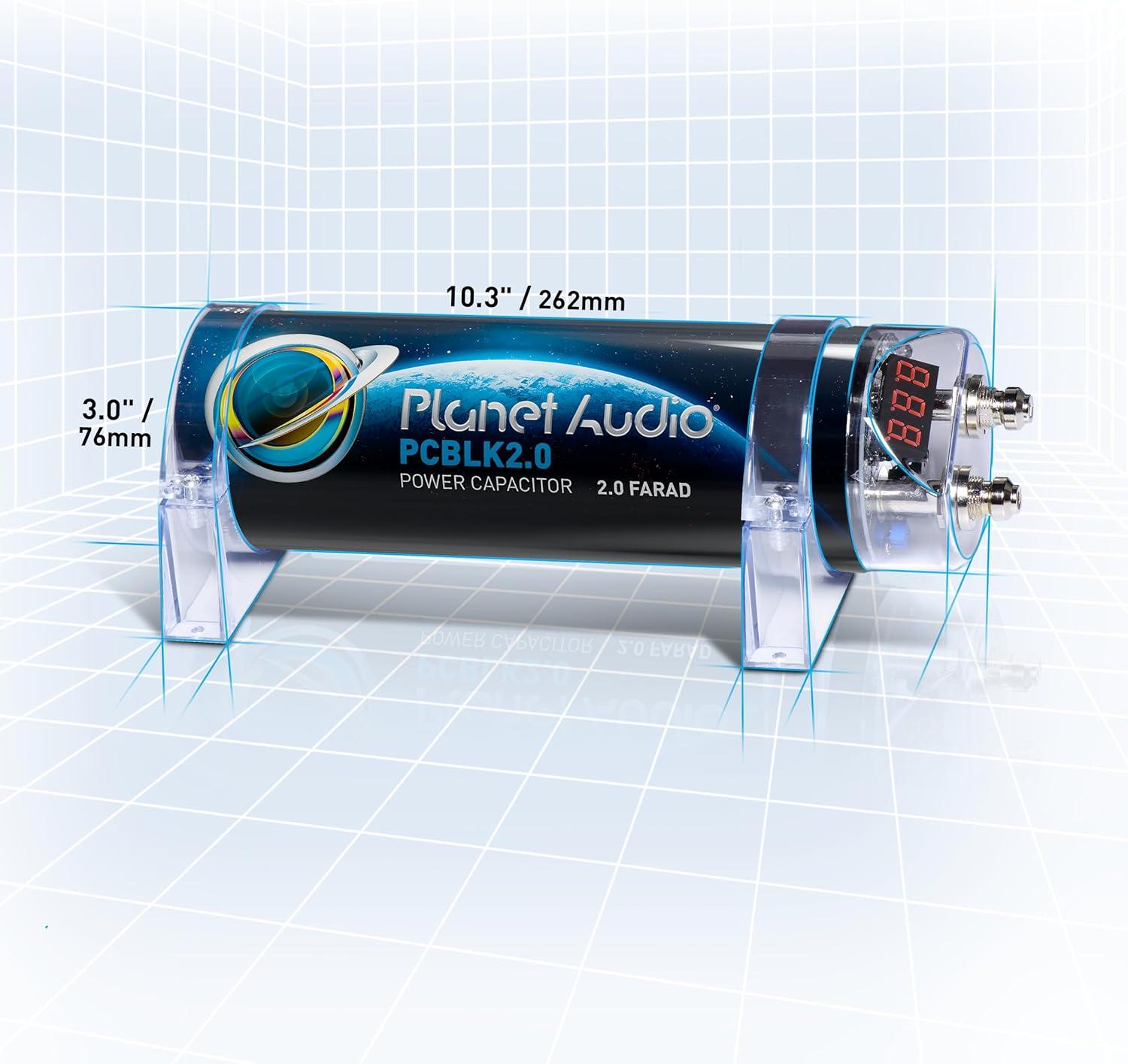 Planet Audio PCBLK2.0 Car Capacitor – 2 Farad, Energy Storage, Enhance Bass from Stereo, Warning Tones, LED Voltage Meter